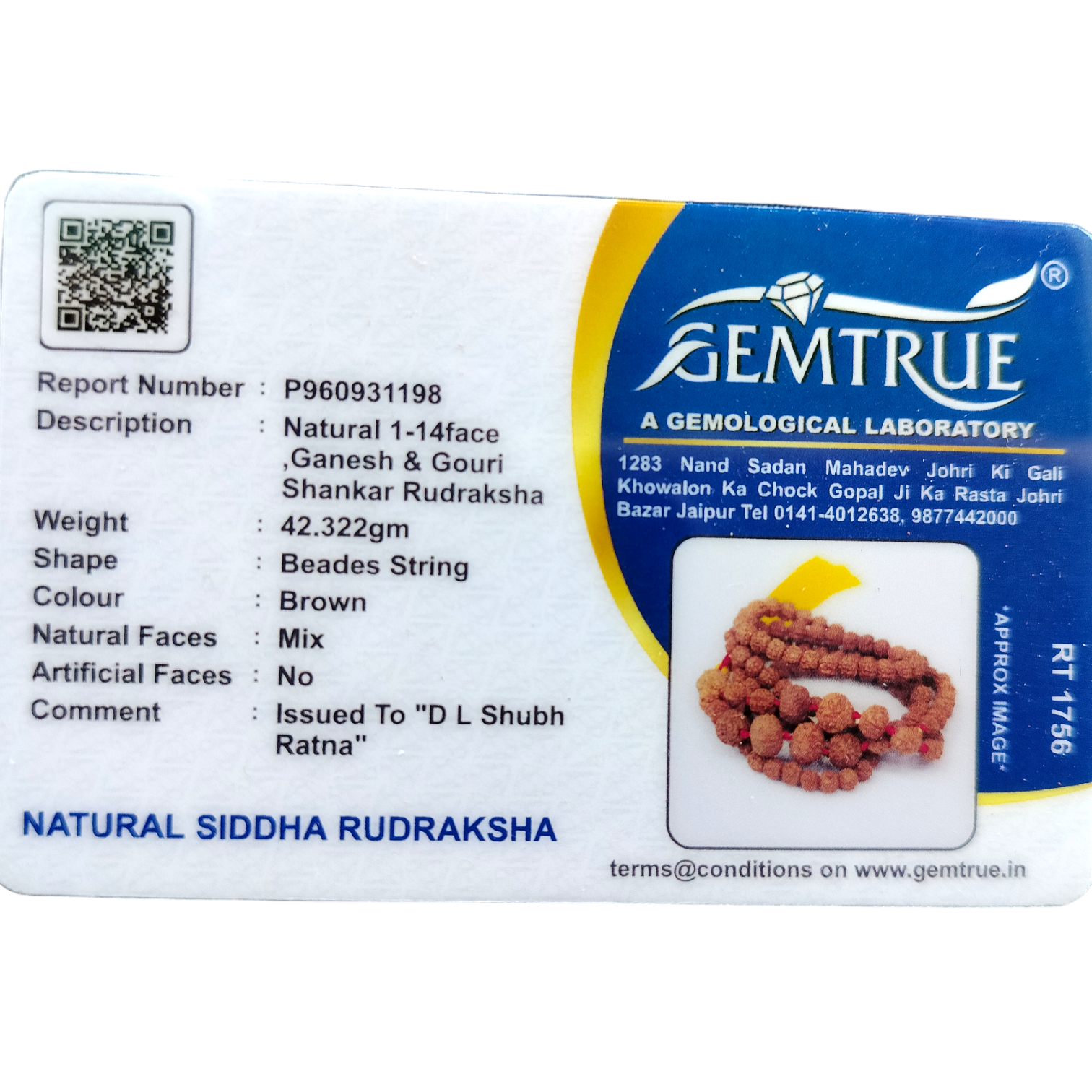 Natural Certified Siddha Mala- 1 to 14 Rudraksha + Gauri Shankar + Ganesh Rudraksha with Silver Capping